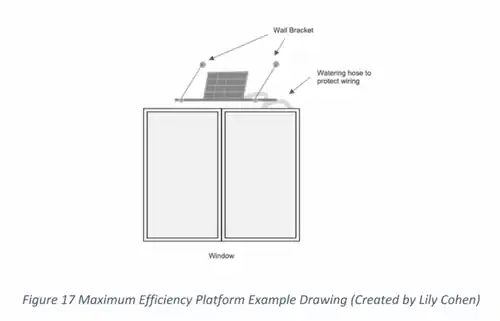 - Max Efficiency Platform - The maximum efficiency platform is a solid platform that can be made by scrap material (wood or sturdy hard plastic) to hold the solar panel at its ideal angle to collect the most energy based on where one is on the planet. For the northern hemisphere that would be to face south at a 30 to 45 degree angle. If the building isn't facing south but rather west or east, you would want to prioritize the time of day at which you will be able to collect the most sun. During the morning and early afternoon hours an eastern facing panel would be ideal but for late afternoon and evening hours you will want your panel to face west as the sun starts to set in that direction. For the southern hemisphere, then one would want to face the panel north instead. The same rules would apply for west and east facing windows. The platform, as can be seen in the image below, will be held up by an angled sturdy cord with the wall and joints connected to the platform and the wall to allow for the platform to fold up when done using. The platform will ideally sit above the window or next to it to get the maximum sunlight. The wiring for the solar can then be placed in a garden hose material and mesh on the ends to protect animals and bugs from entering the home. This solution would fit the criteria because it would allow for maximum efficiency of the solar panel, is accessible to all that have a window, and it uses fairly minimal materials for the mount system.