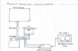Wires from the panel connect directly to the 10 amp pulse-width modulation charge controller, mounted on the inside wall-flush side of the rack. See Construction for connection order to charge controller as this does matter. Also on the rack shelf is the 12V deep cycle lead acid battery, connected to the charge controller via a positive and negative wire which meet the battery terminals by loop end wire terminals. On the positive wire is a 20 amp fuse encased in an inline fuse housing, joined by solderless butt connectors. Also connected to the battery is the 200 watt inverter, on the same side of the terminals as the charge controller. A wiring diagram detailing the operative wiring of the system can be found to the right. The fan plugs directly into the inverter. All connections are encased in heat shrink for added safety. Wires pass through a gap between the rack and the fan inside a segment of laundry hose, or whatever the user has access to that would serve as both an ultraviolet- and weatherproofing pass through facet, protecting the wires from the elements.