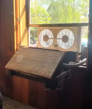 6. Set up the display in the window - Once the mount is done and the panel connections are put in place, you can start to display your panel outside and see if the prototype works. It is recommended that once you display the fan and its mount that you keep all the electrical components inside the house in a dark cool box. This will prevent access to the battery which can cause shocks if manevered inappropriately or to keep it out of hands of children. It is also advised to screw the charge controller into the wall so you can see how full the battery is charged and to make sure that energy is being collected by the panel. When displaying the fan make sure to set a book down first underneath since the mount has some wood covering it initially if you don't do so. You can also place material usually used to be door sweeps to cover any openings at the bottom of the fan to prevent bugs from entering your home.