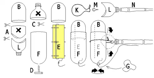 Pull the whole length of wire through the hole in the PET-bottle-bottom and slide in the assembled parts