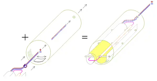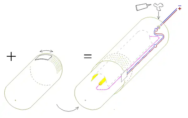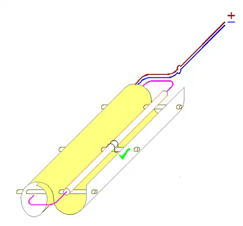 This type of electronic transformer (electronic ballast) has the same dimensions as a electronic inverter. The thyristor component does heat up; do NOT let it touch the plastic foil. In this tube-lamp-cap there is space to make a bigger aluminium heat-sink cooling plate.