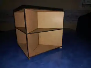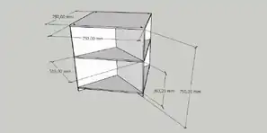 El prototipo consiste en una mesa a escala elaborada con material MDF de 3 mm de grosor. El tamaño de este es de 18.75x18.75x18.75 cm. Con respecto al tamaño real, las medidas de este son 75x75x75 cm. El mueble diseñado consta de un total de 11 piezas: la superficie de la mesa, las bases de la mesa, las pestañas de refuerzo y los estantes.