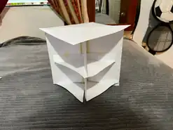 Una vez se tomó esta decisión, y se vislumbraron características importantes para que el diseño funcionara, se procedió a realizar un pretotipo en papel. En este, se cortó cada una de las piezas, pero, debido a que no es un material rígido, se utillizó cinta adhesiva para mantenerlas unidas. Al igual que el diseño en Paint, sirvió para obtener una idea básica de qué debía hacerse para que las piezas encajaran correctamente, y la forma que cada una debía tener para utilizar de la mejor forma posible el material.