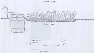 El sistema original era un pantano artificial con un tanque de reserva que no contaba con un sistema de filtración de grasas. El tanque de reserva era un contenedor de 55 gallones de capacidad ubicado enteramente bajo tierra. El agua fluía directamente del lavabo de la cocina hacia este contenedor. Cuando el contenedor se llenaba, el agua fluía a través de un desagüe (embudo) hasta el estanque. El estanque era rectangular de 5 x 10 pies, con una profundidad de aproximadamente 4-6 pulgadas. La membrana a prueba de agua estaba hecha de polietileno lleno de grava y paja totora. En este sistema el agua no se re utilizaba, simplemente se depositaba en el estanque. Cuando de-construimos el sistema no teníamos claro porque había una cisterna en primer lugar, una tubería que conecte directamente al lavado de la cocina con el estanque hubiera tenido el mismo efecto.