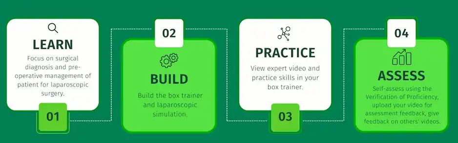 While this course is available to any interested surgical learner, our target learner is the surgeon or surgical resident who is already comfortable performing open surgery. The entire module is available through open-source learning on the web through an online, freely accessible site. Users need an unique identifier that they obtain through email signup to track their own learning, but the generation and assignment of the unique identifier is automatic and instantaneous. The materials that are needed to build the box trainer and models are universally available. The only pieces of technology that the learner needs are a cellphone and a computer which are generally available and laparoscopic instruments which are available in the hospital setting.