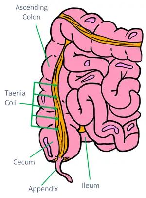 - Has tenia coli – a set of 3 longitudinal bands