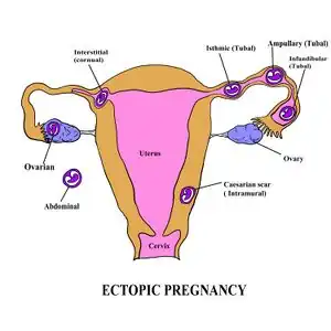 When a fertilized egg grows outside of the uterus. With 9 out of 10 times, the fertilized egg is within the fallopian tube. This can be challenging to differentiate from appendicitis. In all female patients of child-bearing age, obtain a pregnancy test. If the patient has a positive pregnancy test, obtain a right lower quadrant ultrasound.