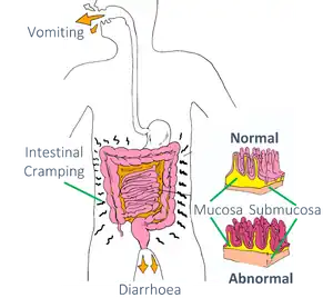 Gastroenteritis, also known as infectious diarrhea is inflammation of the gastrointestinal tract caused most commonly by viruses, but can also be due to bacteria, parasites and fungus. Patients typically present with generalized cramping, abdominal pain, diarrhea, vomiting and anorexia. Unlike in appendicitis, the patient's contacts and diets become important. Patients are typically exposed to a sick contact or contaminated food prior to developing symptoms.