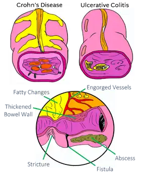 The principal types of inflammatory bowel disease are Crohn's disease (affecting the small intestine and large intestine, as well as the mouth, esophagus, stomach and the anus) and ulcerative colitis (primarily affecting the colon and rectum). Symptoms of Inflammatory bowel disease include, abdominal pain, diarrhea, rectal bleeding, severe abdominal cramps and weight loss. Unlike patients with appendicitis, patients with inflammatory bowel disease will have more than just abdominal pain.