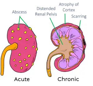 Pyelonephritis in an ascending infection of the upper urinary tract, specifically the renal parenchyma and renal pelvis. Pyelonephritis can be acute or chronic. If not treated it can lead to sepsis and renal abscesses and may cause secondary hypertension and renal failure. Unlike appendicitis, pyelonephritis presents more commonly in women due to shorter urethra and the urine analysis would demonstrate pyuria and bacteriuria.