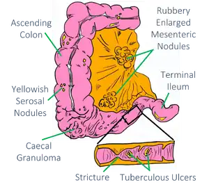 Gastrointestinal Tuberculosis is a type of extrapulmonary tuberculosis that typically presents with pulmonary symptoms, but rarely may present alone. It accounts for 1-3% of the tuberculosis cases worldwide. Patients may have a subacute presentation with generalized abdominal pain that can mimic acute appendicitis. However, patients with gastrointestinal tuberculosis are likely to have systemic symptoms including hepatosplenomegaly, weight loss or lymphadenopathy. Patients may have a tuberculosis-associated perforation or obstruction. If surgical intervention is necessary, a right lower quadrant incision is NOT recommended because the whole bowel needs to be assessed.
