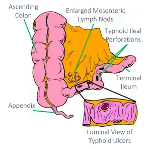 Typhoid is a bacterial infection caused by the Salmonella serotype Typhi bacteria. It is spread by eating food or drinking water contaminated with the feces from an infected person. Symptoms include high fever, diarrhea and vomiting. One in ten patients may have an urgent complication including perforation of intestinal ulcers. Patients may have perforated ulcers that require a surgical intervention. Unlike appendicitis, patients with typhoid ulcers present with a delayed peritoneal response. If surgical intervention is necessary, a right lower quadrant incision is NOT recommended because the entire bowel should be assessed for typhoid lesions.