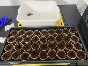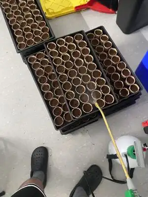 Spray all germination coco-coir cups with water to ensure proper hydration before germination. Make sure that all coco-coir cups are sprayed with enough water, indicated by the top of the coco-coir cups darkening in color.