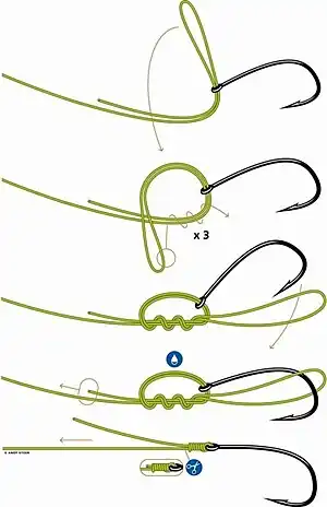 - Tie the line to the hook, ensuring a good tie of the line. Grab the printed part to twist the line for the knot being made on the line.