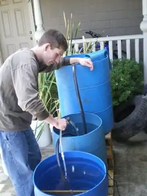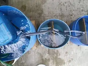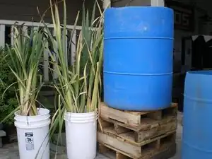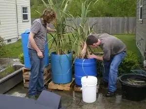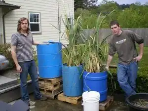 Bacteria that colonize around the roots of wetland species create symbiotic relationships with the plants that provide them with a sanctuary to proliferate. Both the bacteria and microorganisms that colonize in a microbial slime amongst the cattail and bulrush roots work to remediate the water along with the plants. Having healthy colonies of these organisms greatly increases the filtration capacity which will be of great importance in our own system. These organisms require oxygen to metabolize toxic matter in the water and when they don't have this oxygen they die and anaerobic conditions are created which produce strong odors that wouldn't be desirable in a residential greywater treatment system. Since our system incorporates three barrels totaling approximately 120 gallons, it was paramount that we prevent stratification of the water column and do whatever is necessary to encourage mixing within the water column.