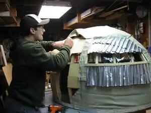 Staple aluminum can shingles on top of the roofing paper, starting at the bottom of your shell and overlaying additional layers of shingles so that when rainwater runs down your shell the water will flow off of one shingle onto another. Do not start at the top! If you do, rainwater will catch behind the lower shingles causing your shell to leak. Once the shingles have been attached, cut off the excess on the edges to create a flush edge. Caution! Shingle edges can be very sharp, so when cutting the edges wear protective gloves to prevent injury.