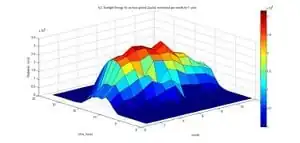 Fig2 shows a graphical representation of the solar data from the Queen's University Live Building. Conceptially the graph makes sense. As the z variable approaches the longest day of the year it peaks at noon. All other points away from this 'fall off the cliff' i.e. decrease. There are spikes indicative of noise, this is perfectly normal for experimental data points.