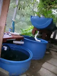 Other designs do not have valves but, instead, commit to manual labor. An aquaponics system was constructed for free in Thailand and requires no electrical input.[21] The following items are needed: a tank to hold the fish (like a large plastic tub), container for the plants, means to elevate plants above fish tank and a watering device.[21] To start up this system, it is important to put the fish in a least a week before. Also, before watering the plants, swirl the fish-rearing tank then fill the watering can. In this system, the fish-rearing tank will need to be cleaned periodically. Finally, it is important to flood containers at least three times a day.[21]