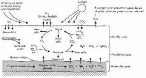 Arcata's oxidation ponds are facultative ponds, which are used primarily by small communities for the removal of organic wastes from waste water. Oxidation ponds consist of about 25% of America's municipal waste water treatment facilities, since maintenance and removal is inexpensive. The process involves first introducing wastewater, which contains "suspended solids" (colloid) The insoluble solids, referred to as settable solids (dead algae and other compounds) in Figure 2 sink to the bottom of the pond to promote an anaerobic layer of bacteria.[1] Above this layer and at the water surface, aerobic bacteria exist due to the sunlight and presence of oxygen from photosynthesis. The combination of the two bacterial layers create a facultative pond due to the varying penetration of light throughout the pond. The facultative bacteria inhabit the center of the pond, and are able to acquire energy both aerobically and anaerobically from compounds like sulfates and phosphates illustrated in Figure 2 below.