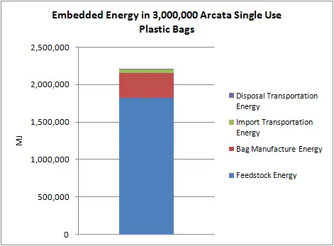 The result of a brief study by the course showed that Arcatans use between 3 and 5 million single use plastic bags per year. A more in-depth study of impacts, conducted by the course, resulted in this spreadsheet that allows a user to enter values such as shipping companies, shipping ports, manufacturers, number of bags used, number of bags recycled, grid mix of manufacturer, bag materials, etc. to calculate embedded energy and emissions. At the low end of 3 million single use plastic bags per year (and other average assumptions shown in the spreadsheet), the impacts of Arcata's single use plastic bag yearly habit include:
