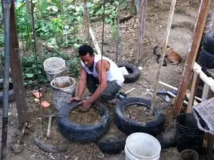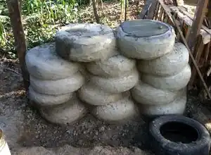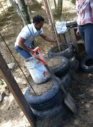 Plaster the tires with sawdust plaster. Ingredients: 22 gallons of sawdust, 2 gallons of lime, 16 and 1/2 gallons of sifted sand, 1 bag of cement, and roughly 20-22 gallons of water. This produces roughly 40 gallons of plaster. (This plaster was created by the Las Malvinas ecoladrillo schoolroom Practivistas team.)