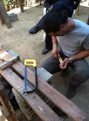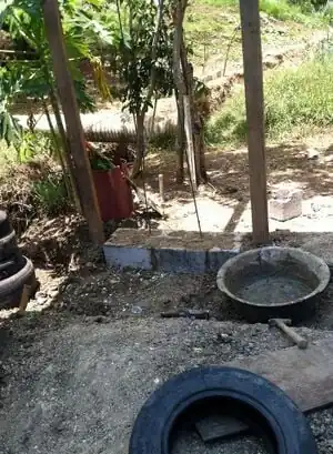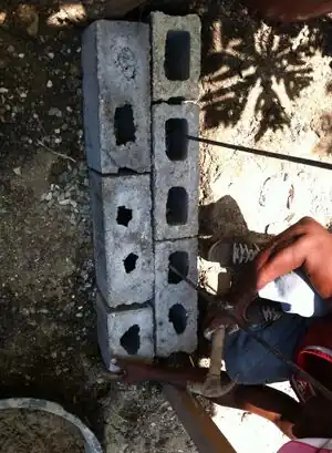 Place blocks on top of gravel, and level. Then, hammer a couple pieces of 10 foot rebar, two feet deep into the ground for structural support. Note: We used eco-blocks, developed by the Las Malvinas Practivistas 2014 team.