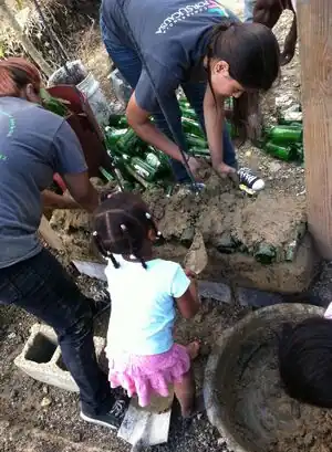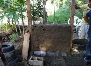 Lay earthen mortar, and add rows of large Presidente bottles. Each bottle was laid facing the opposite direction as the one next to it. As you move up the wall, take the time to pack the earth tightly around each bottle. Use a piece of wood on each side to check that each row is level before adding the next row of bottles.