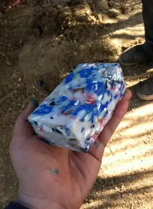 Experiment #2 | This experiment was conducted in the city with consistent electricity, on the same sandwich grill, and the same wax paper. The difference with this was that we got the sandwich grill up to temperature before placing the plastic inside. We also started at a medium temperature and increased it when we noticed that nothing had melted after 10 minutes. This sample of melted plastic was placed under 6 thin terra cotta tiles to cool with not much pressure, which caused many wrinkles in the final product due to plastic shrinkage upon cooling. |