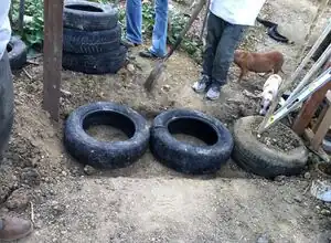 Fill tires with clay and earth mixture, packing the tire as full as possible with a metal malette.