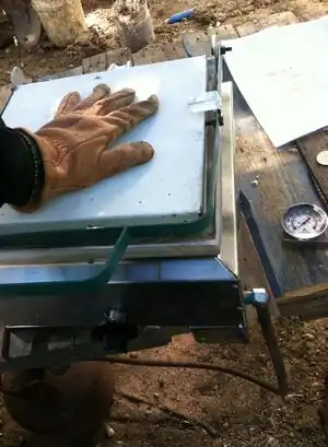 Melt the plastic: We purchased a propane powered large grill with a flat surface to melt larger pieces of tile in the same way as Step 5. Results: At the lowest setting, which is around 325 degrees F, we successfully melted 1/4" thick tiles of plastic without melting the wax paper.