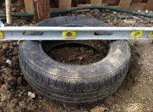 Use a level on each tire as you build the earthship wall, ensuring structural integrity.