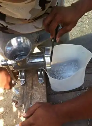 Cut the plastic: We experimented cutting plastic with a meat grinder to make even smaller pieces of plastic. Results: The final product was not worth the additional work of grinding plastic with the meat grinder. You need a very sturdy meat grinder to grind the plastic, which ours was not. Also, it could potentially work more efficiently if you connected the crank apparatus to a DC motor and a car battery.