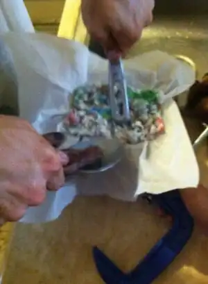 Melt the plastic: We experimented with melting plastic in a standard sized sandwich maker like this. First, we placed wax paper on the sandwich grill, placed plastic confetti on the paper, and placed a second piece of wax paper on top of the plastic confetti. Close sandwich grill and heat it up to 350 degrees F to melt the plastic. Results: The tiles were successful, but fairly thin. Also, wax paper melted to the plastic. Parchment paper is ideal for this method, and can be found at La Sirena (Jose Contreras) in Santo Domingo, Dominican Republic.