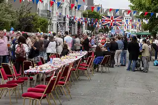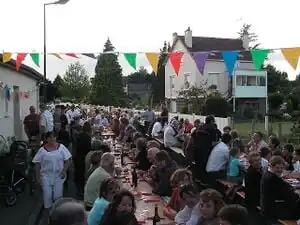 A block party or street party is a party in which many members of a single community congregate, either to observe an event of some importance or simply for mutual solidarity and enjoyment. The name comes from the form of the party, which often involves closing an entire city block to vehicle traffic or just a single street. Many times, there will be a celebration in the form of playing music, games, dance and activities with food such as popcorn machines and barbecues. When multiple streets become cordoned off, those are referred to as street fairs. These gatherings are especially popular during holidays or local celebrations and may range from informal get-togethers to large public events. The tradition has evolved globally, with local variations reflecting cultural, historical, and political contexts.