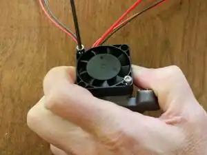 Attach fan to the end effector.Only two M3 x 12mm screws are required to affix the fan to the end effector: Place the fan over the opening with the wires exiting the fan towards the top of the effector and the fan spider (the part that usually has a sticker on it) facing the interior of the effector so that the fan is blowing air into the end effector (some fans have arrows embossed in the case indicating rotation and airflow direction). Align the fan's mounting holes with the holes in the fan opening and plastiform M3 x 12mm screws into opposite corners of the fan.