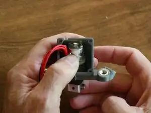 Pressing hot end into slot. Push the hot end into the slot - considerable force is necessary, use a tool against the hot end if necessary. If the hot end slides in easily, it may need to be epoxied in place as it will move around during printing, causing noise in the print.