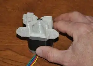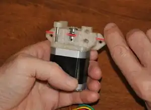 Motor with drive body properly oriented.With the motor laying on the table, wires exiting towards you, orient the printed drive body with the conical section towards you, as shown in the picture.