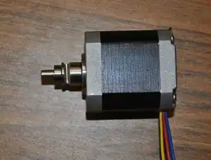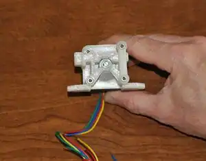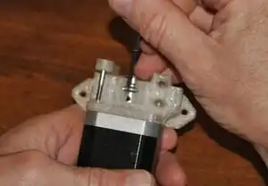Motor with drive gear and bearing.Place the Mk7 drive gear on the motor with the set screw on the flat side of the shaft. Screw in the set screw so that it keeps the drive gear from rotating off the flat but does not fix it tightly to the shaft - you will align the drive gear in a later step, so it must be free to move up and down the shaft, but not rotate on the shaft. Place the MR105z bearing on the shaft above the drive gear.