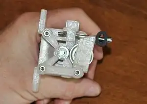 Attaching idler.Place the idler on its pivot (the screw under the floating end of the linking rod) and push the M3 x 45mm screws into the matching holes in the idler housing.