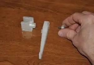 Idler housing on fuel line to mark first hole.The drive uses the small piece of rubber fuel line as a compression spring. Two holes must be drilled to align with the slots in the end of the printed idler housing. Lay the housing on the hose and mark the first hole with the 3mm drill bit.