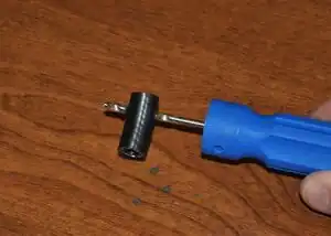 Properly positioned drive gear set screw.Using the small screwdriver against the knurled portion of the drive gear, rotate the drive gear until the set screw is accessible through the gap.