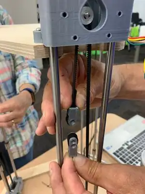 The belt terminators (assembly steps detailed below) have a narrow passage that the belt passes through twice - that passage needs to be cleaned with the precision knife. (During printing of the terminators, small protrusions form, making it very difficult to slide the belt through the passage.) Additional insurance against loss of belt tension is afforded by the small wire ties on the belt tails.