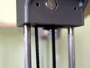 String belts over pulleys and idler bearings. Make a loop in the belt and insert through the top of the motor end on one side of the motor. Rotate and move the loop such that it engages the pulley. With the guide rods nearest you (such that other two sets are farther away) pass the belt over the idler bearing starting from your left side (the side of the idler end nearest the bearings). The two ends of the belt should meet on the left side. See picture in next step.