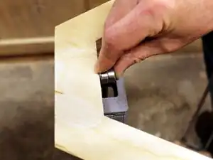 Align jig with donut and attach with #6 x 3/4" sheet metal screws. A friend is useful for this step and it is important that the jig is properly placed as this sets printer geometry, ensuring print quality. Lay the plywood donut on the table, ugly side up. Place the wide side of the idler placement jig against a short inside leg of the hexagon, making sure the jig is fully flush against the leg. Start one #6 x 3/4" sheet metal screw into the donut, but don't tighten until you have the jig properly placed. Tighten the screw, check the jig position and run the remaining screws into the donut. Repeat this step with the remaining two idler/guide/motor assemblies.