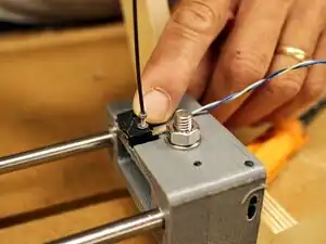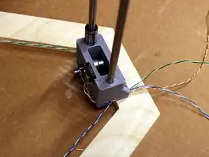 Route the limit switch wires. All of the limit switch wires will run down one of the apexes. There are small holes in the tops of the idler ends through which the limit switch wires are run. Route the wires from two of the apexes to the third such that they neatly meet at the hole exiting the top, right of the third idler end (see picture). The holes are small; when running all three through the last one, pull one pair at a time and with the last wire, pull the previous two towards the interior and then use them to help the third pair through.