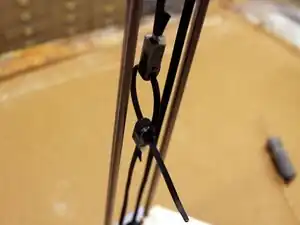 Tighten belts. Rotate the frame such that you're looking at one of the apexes across the interior of the frame. Start a large wire tie through the fixed belt terminator and then back into the interior of the frame through the free belt terminator. Secure the wire tie and use a needlenose pliers or lineman's pliers to pull the wire tie until the belt twangs when plucked (regular pliers tend to cut through the wire tie with potentially catastrophic consequence).