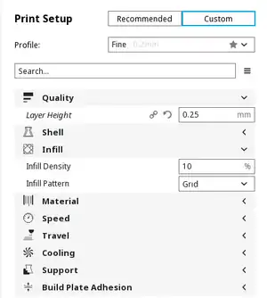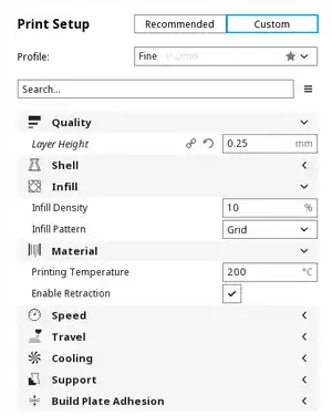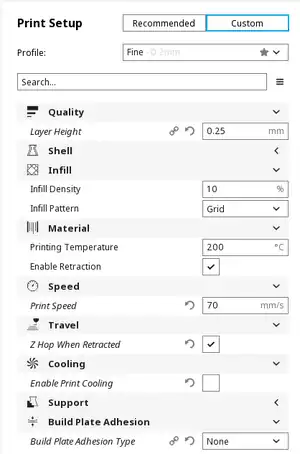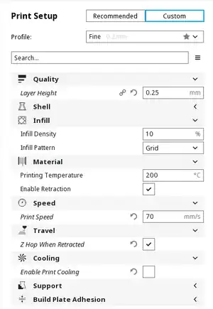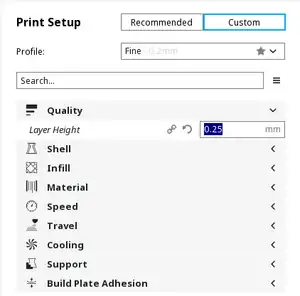 Set layer height to 0.25 mm. In the settings bar on the right side of the window, expand Quality and set Layer Height to 0.25 mm.