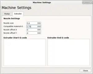 Extruder settings. Click on the Extruder tab in the Machine Setting dialog. Set the nozzle size to 0.4 mm and the Compatible material diameter to 1.75 mm. Close both the open menu dialogs.