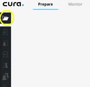 The "Load File" button on Cura. Start Cura, and press the "Load File" button located on the top left of the object view window.