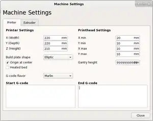Machine settings. Set all X ()width), Y (Depth) and Z (Height) to 210 mm. Uncheck Heated bed and clear all of the text from the Start G-code and End G-code text boxes.